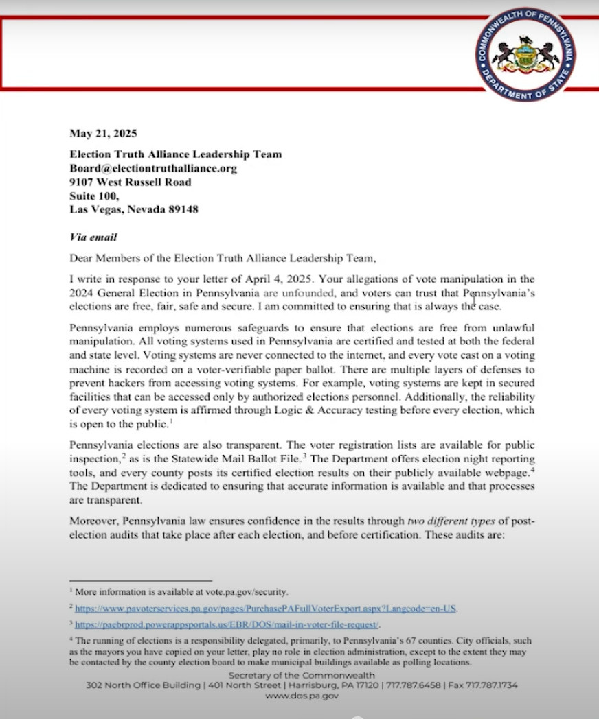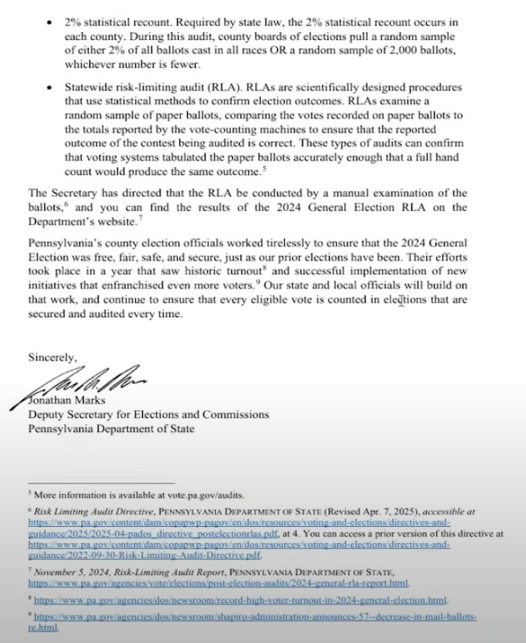 Including this letter matters for transparency. It represents the official state position. But it also underscores the problem: Pennsylvania continues to rely on the same limited, pre-digital safeguards that were never designed to detect data-level manipulation. In an era of AI interference and uncertified machine updates, these old assurances amount to auditing a lock after the keys have already been copied.
