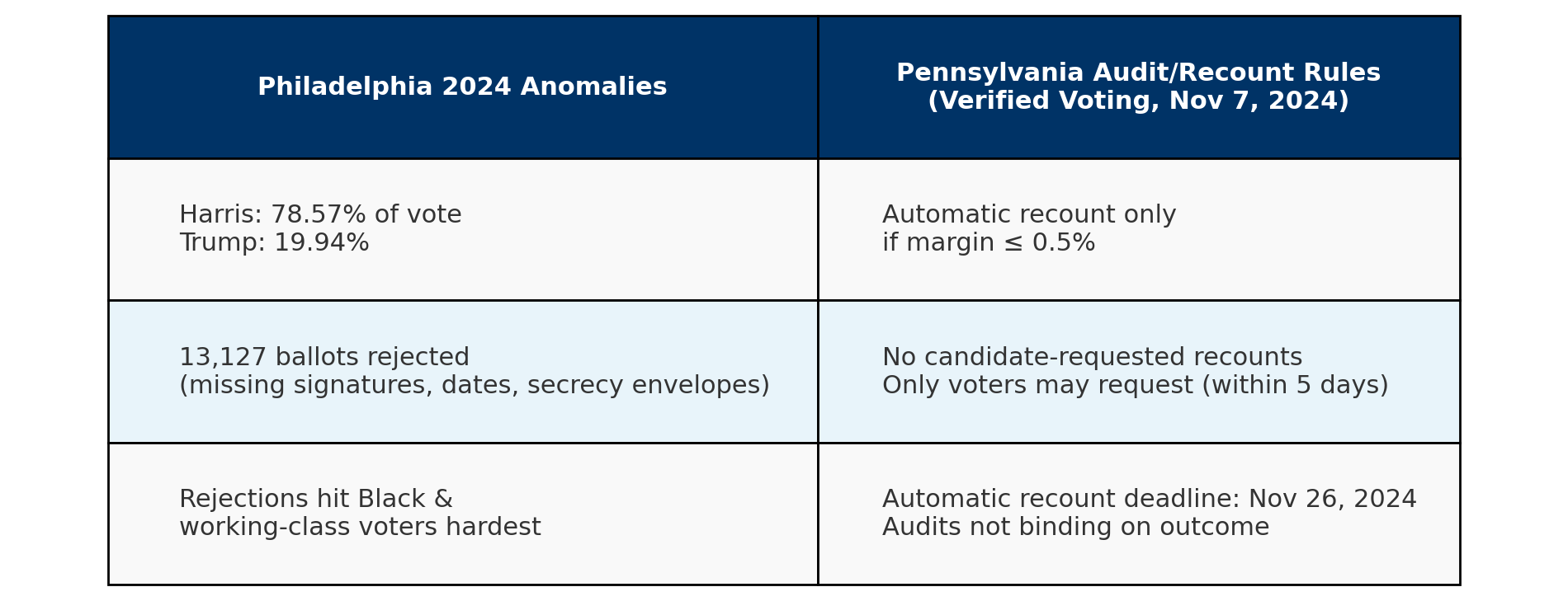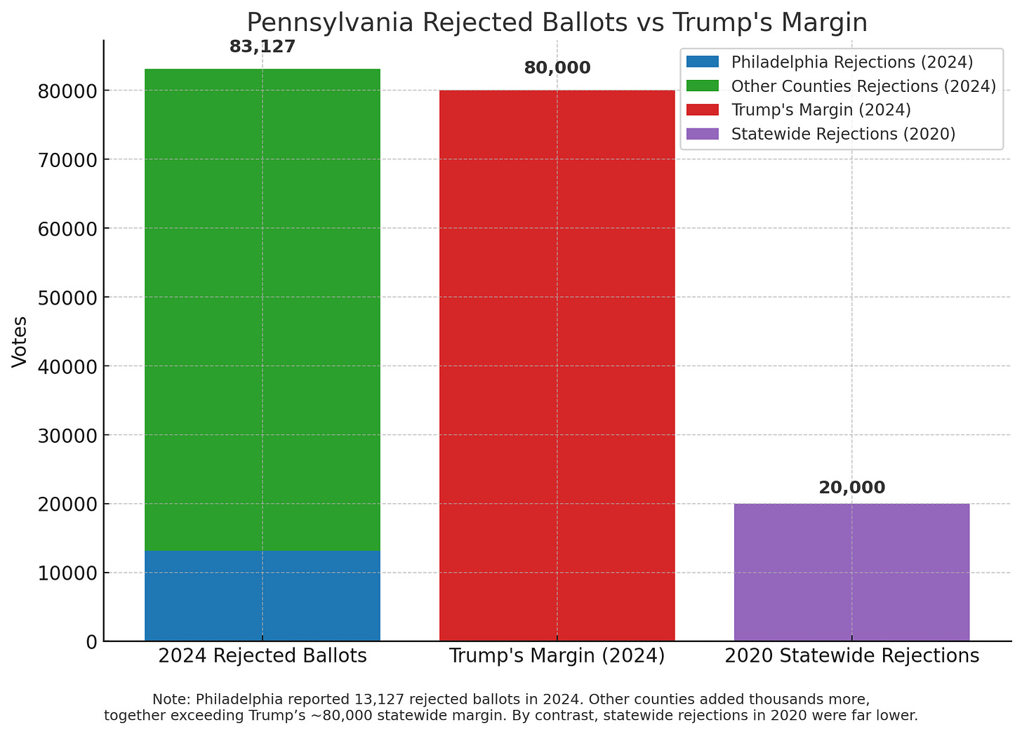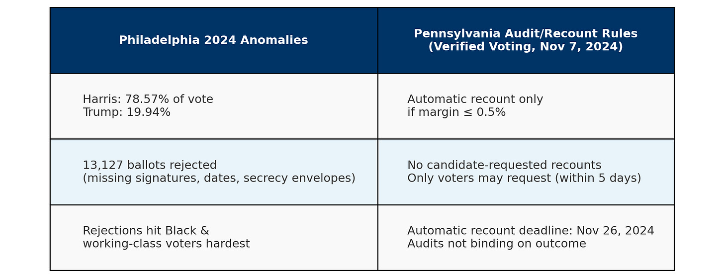 Update (August 27, 2025): Clarification on Pennsylvania’s recount rules—some readers noted that Philadelphia’s 13,127 rejected ballots alone wouldn’t trigger an automatic recount. True. But that’s the trap: PA only auto-recounts at ≤0.5% (≈35,171 votes in 2024), candidates can’t request one, and voters have just 5 days after county certification to file. Philadelphia is one county; add Allegheny, Erie, and others and you’re in the tens of thousands—stacked against Trump’s reported 120,206 statewide margin.