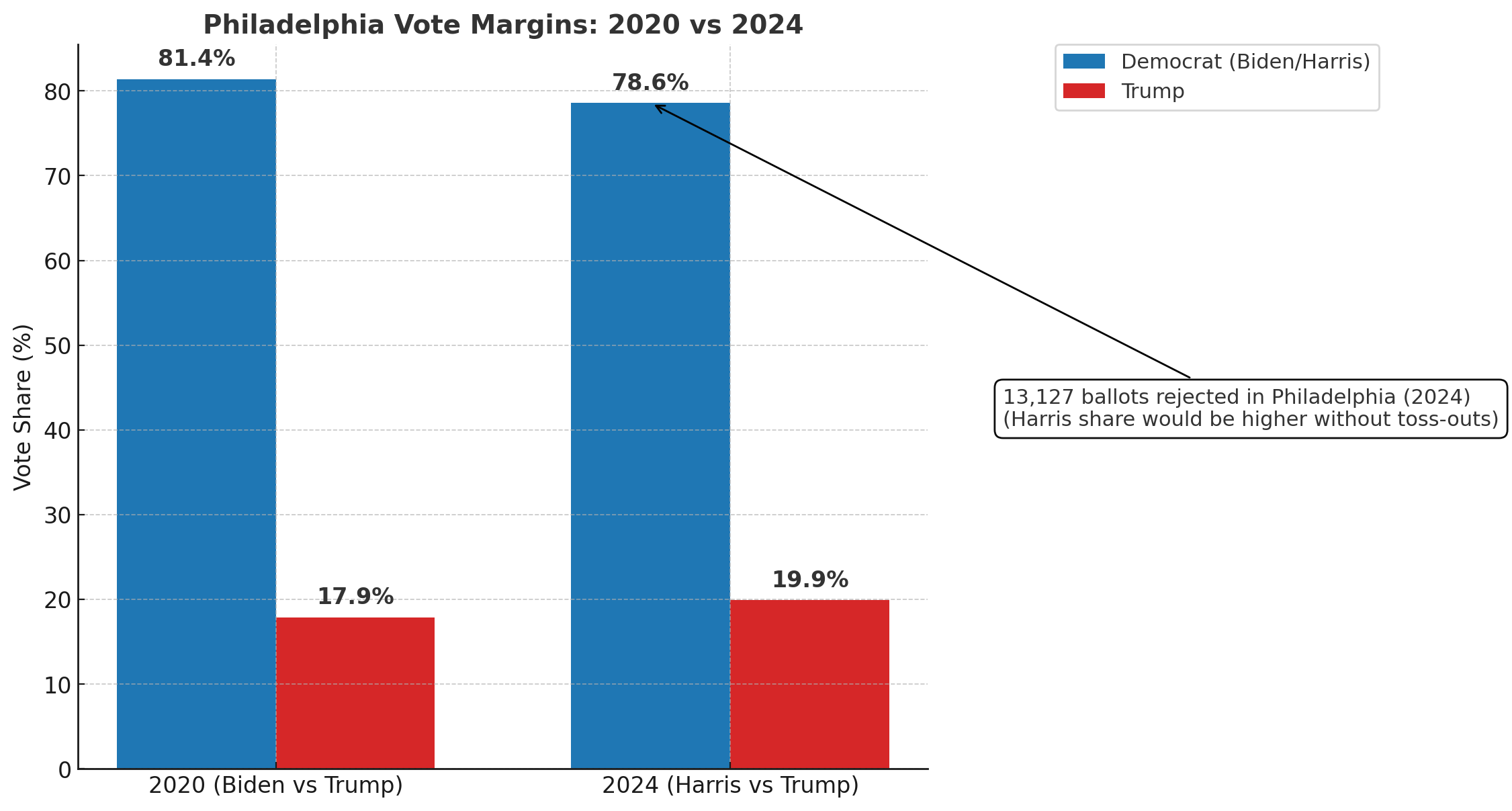 Philadelphia tells the story. Harris captured 78.57% of the vote there, compared to Trump’s 19.94%. That margin should have locked down the state. [4] Biden carried Philadelphia with ~81% in 2020 and won Pennsylvania; Harris was right in line with those numbers in 2024. [4]